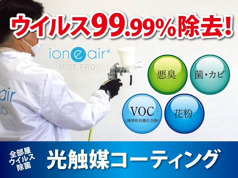 イオニアミストというウイルスや細菌などを不活性化させる光触媒コーティングを住宅の壁面に施工してあります。
