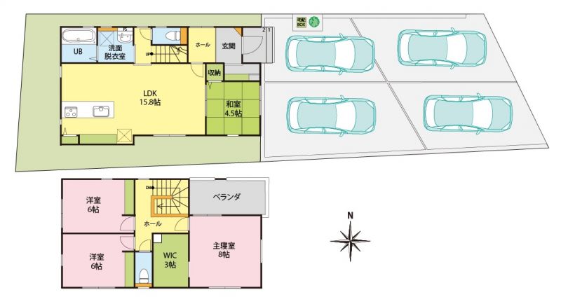 | 設備 | 温水洗浄便座、トイレ2ヶ所、追焚機能、浴室乾燥機、システムキッチン、カウンターキッチン、IHクッキングヒーター、浄水器、食器洗浄乾燥機、ウォークインクローゼット、床下収納、洗髪洗面化粧台、照明器具、電気、上水道、下水道、複層ガラス、エアコン、モニタ付インターホン、駐車場3台分、カーポート付 | ||