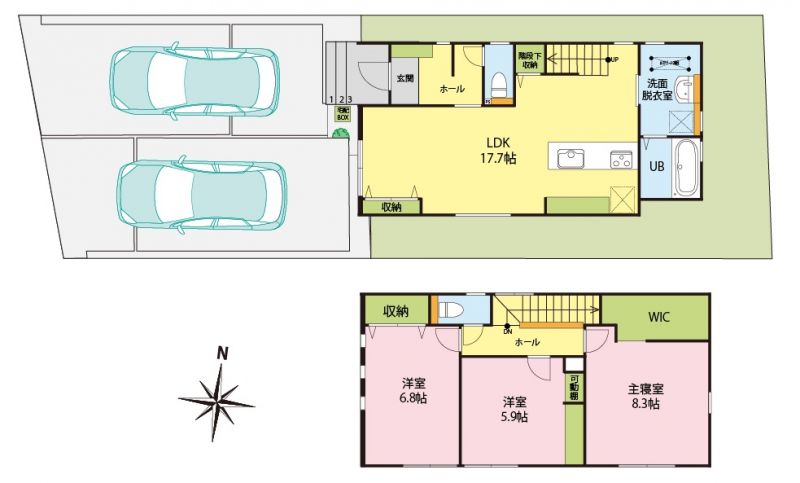 | 設備 | 温水洗浄便座、トイレ2ヶ所、追焚機能、浴室乾燥機、システムキッチン、IHクッキングヒーター、浄水器、食器洗浄乾燥機、ウォークインクローゼット、床下収納、洗髪洗面化粧台、照明器具、電気、上水道、下水道、複層ガラス、エアコン、インターネット、モニタ付インターホン、駐車場2台分、カーポート付 | ||